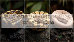 Though color morphs seem fluid, they’re surprisingly stable. Genetic expression locks your carpet python’s hue after the first year, with only subtle environmental influence or occasional color fading affecting perceived intensity, never transforming the underlying morph stability or aging color shift dramatically.