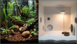 Your chosen material sets the foundation, but ventilation systems and secure lids determine long-term success. Proper airflow management prevents stagnant air while maintaining 40–60% humidity. Two to three 5-inch by 3-inch vents positioned at upper and lower levels create ideal circulation. Escape prevention demands four locking clamps on glass tanks—gaps as small as a corn snake’s snout enable escapes. Mesh top benefits include heat retention with adequate air exchange.