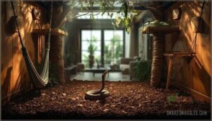 Picture your corn snake gliding through a miniature forest. Start with theme creation—choose habitat design like natural woodland or desert. Add hides, artificial plants, and safe materials like cork bark.