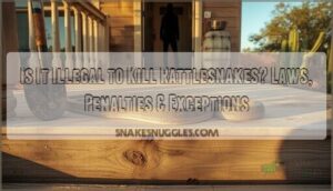 California regulations impose strict wildlife protection on you—intentionally killing rattlesnakes without lawful authority violates the Fish and Game Code, carrying civil penalties up to $5,000 per animal. You’ll face steeper fines and potential criminal charges if you harm protected species like the red diamond rattlesnake.